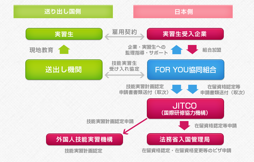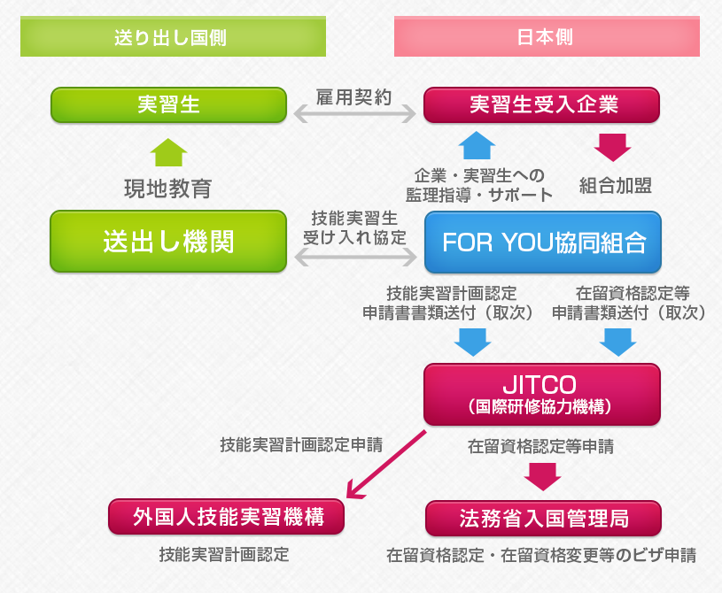 FORYOU協同組合では、主にアジアの公認機関と直接契約を締結しており、厳しい審査に合格した身元が確かで優秀な技能実習生の受け
